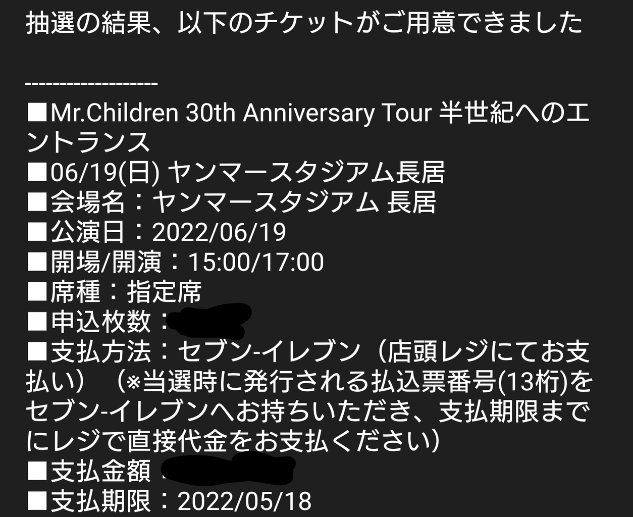 2次抽選の大阪長居ヤンマースタジアム 6月19日ツアーファイナルに再度申込しました…結果は…