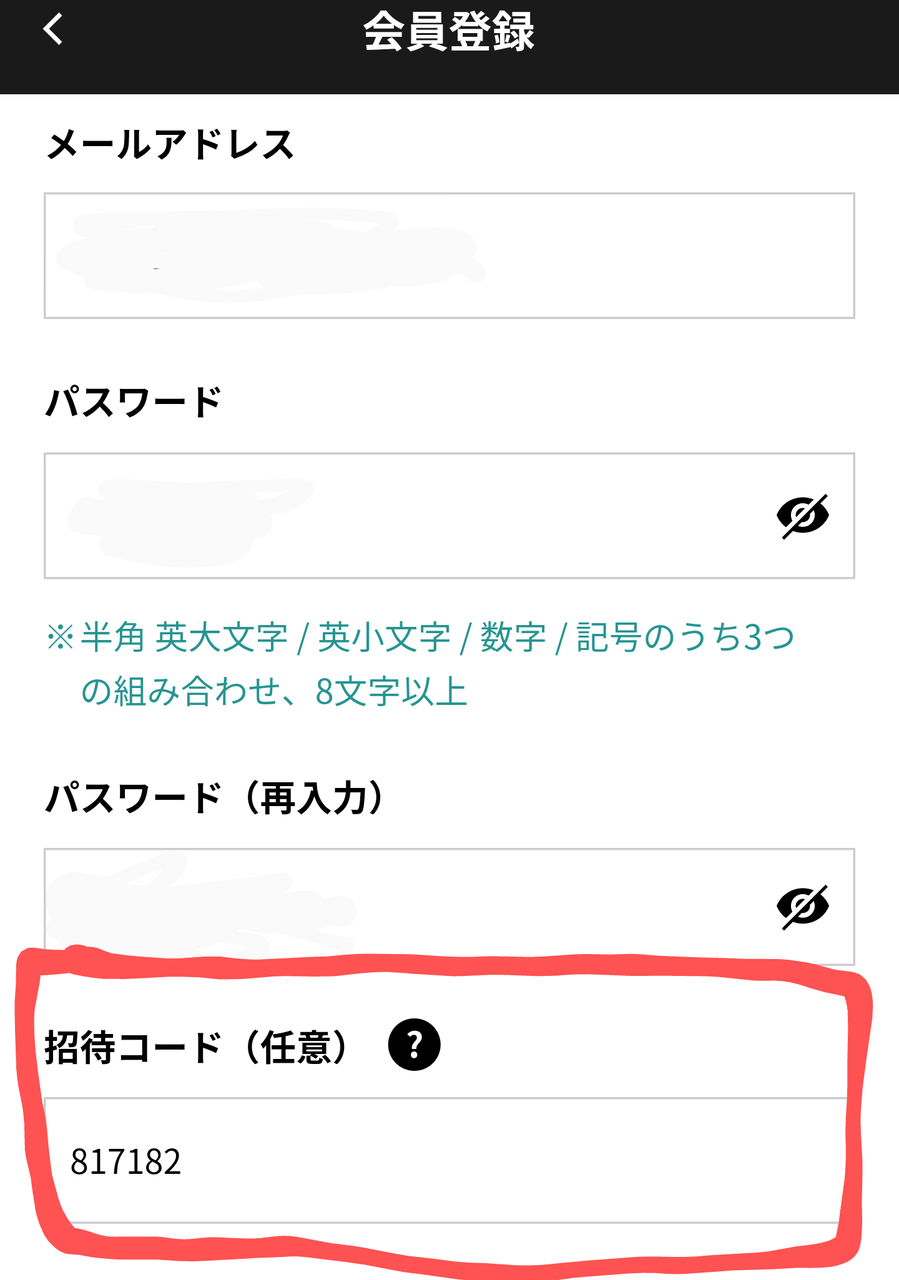 ニックネーム、メールアドレス、ログインパスワードを入力して招待コード【817182】【410253】を入力