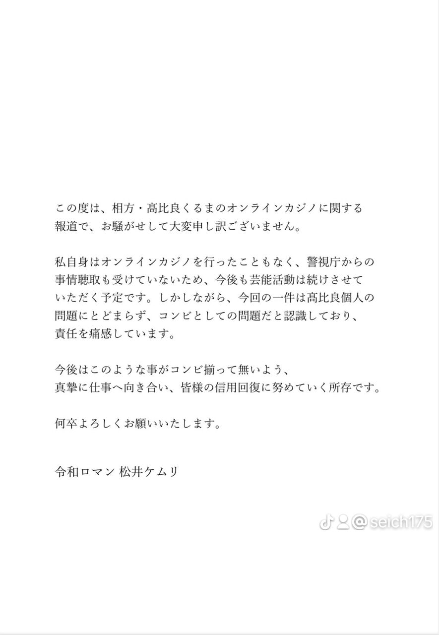 私自身はオンラインカジノを行ったこともなく、警視庁からの事情聴取も受けていないため、今後も芸能活動は続けさせていただく予定です。しかしながら、今回の一件は高比良個人の問題にとどまらず、コンビとしての問題だと認識しており、 責任を痛感しています。