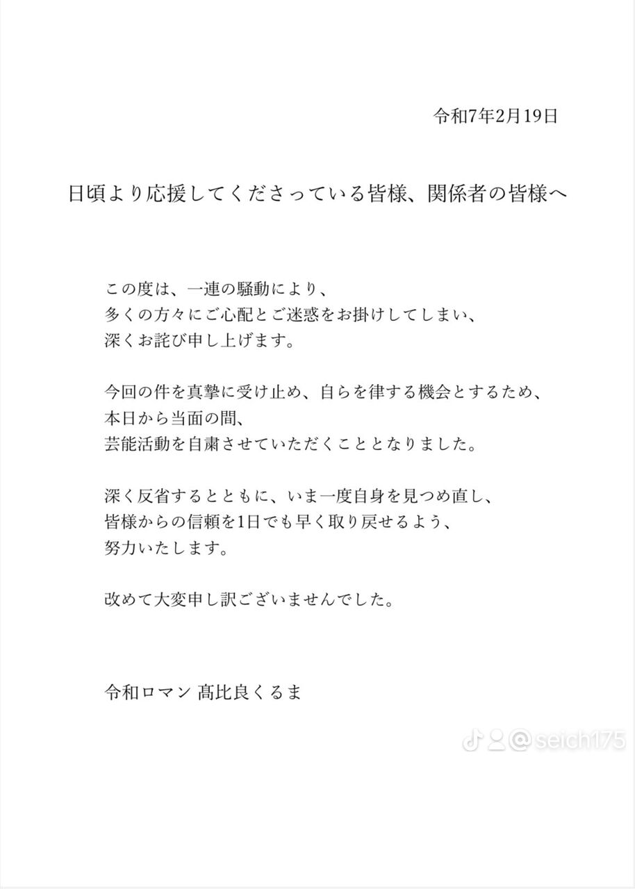 今回の件を真摯に受け止め、自らを律する機会とするため、 本日から当面の間、 芸能活動を自粛させていただくこととなりました。