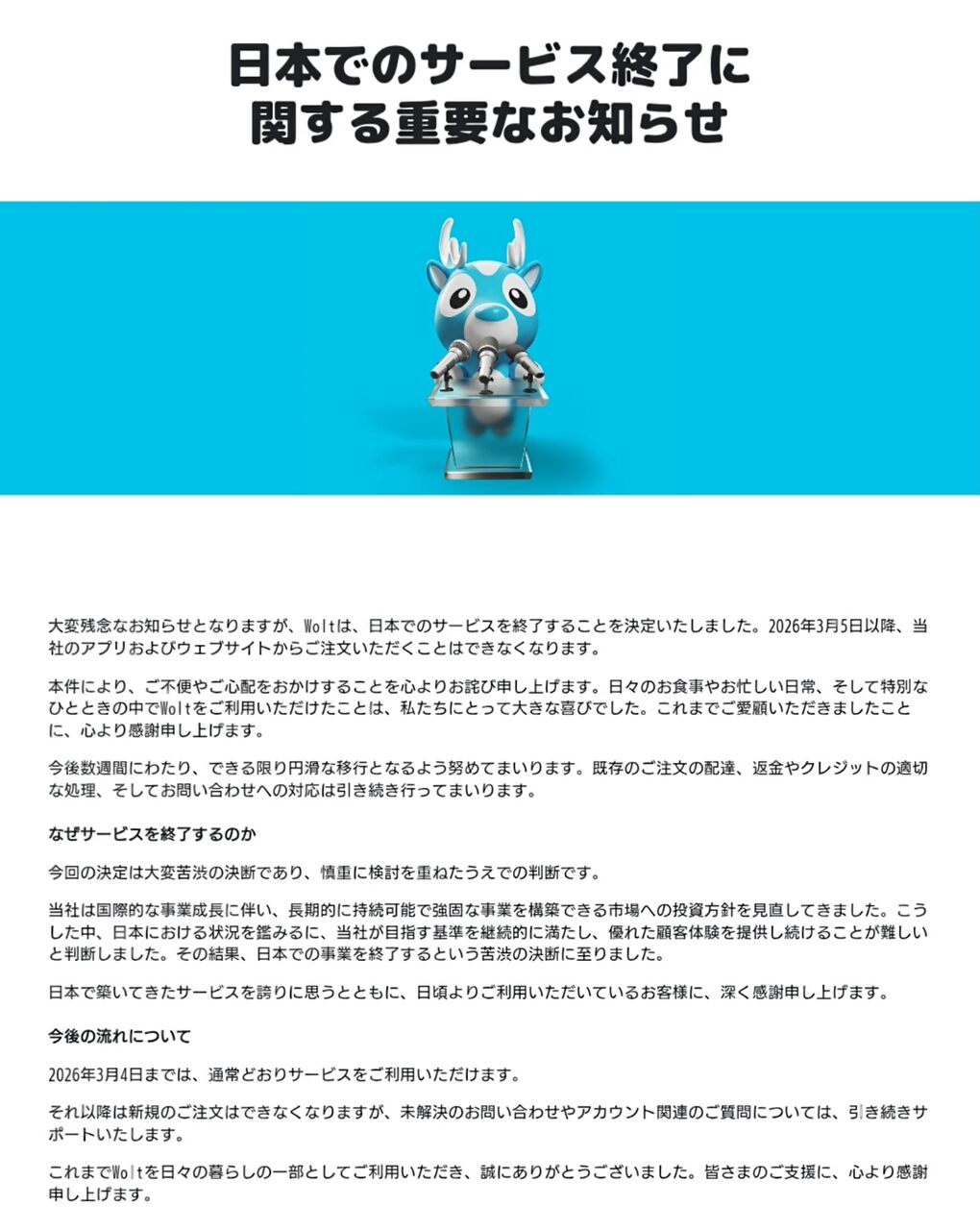 大変残念なお知らせとなりますが、Woltは、日本でのサービスを終了することを決定いたしました。2026年3月5日以降、当社のアプリおよびウェブサイトからご注文いただくことはできなくなります。